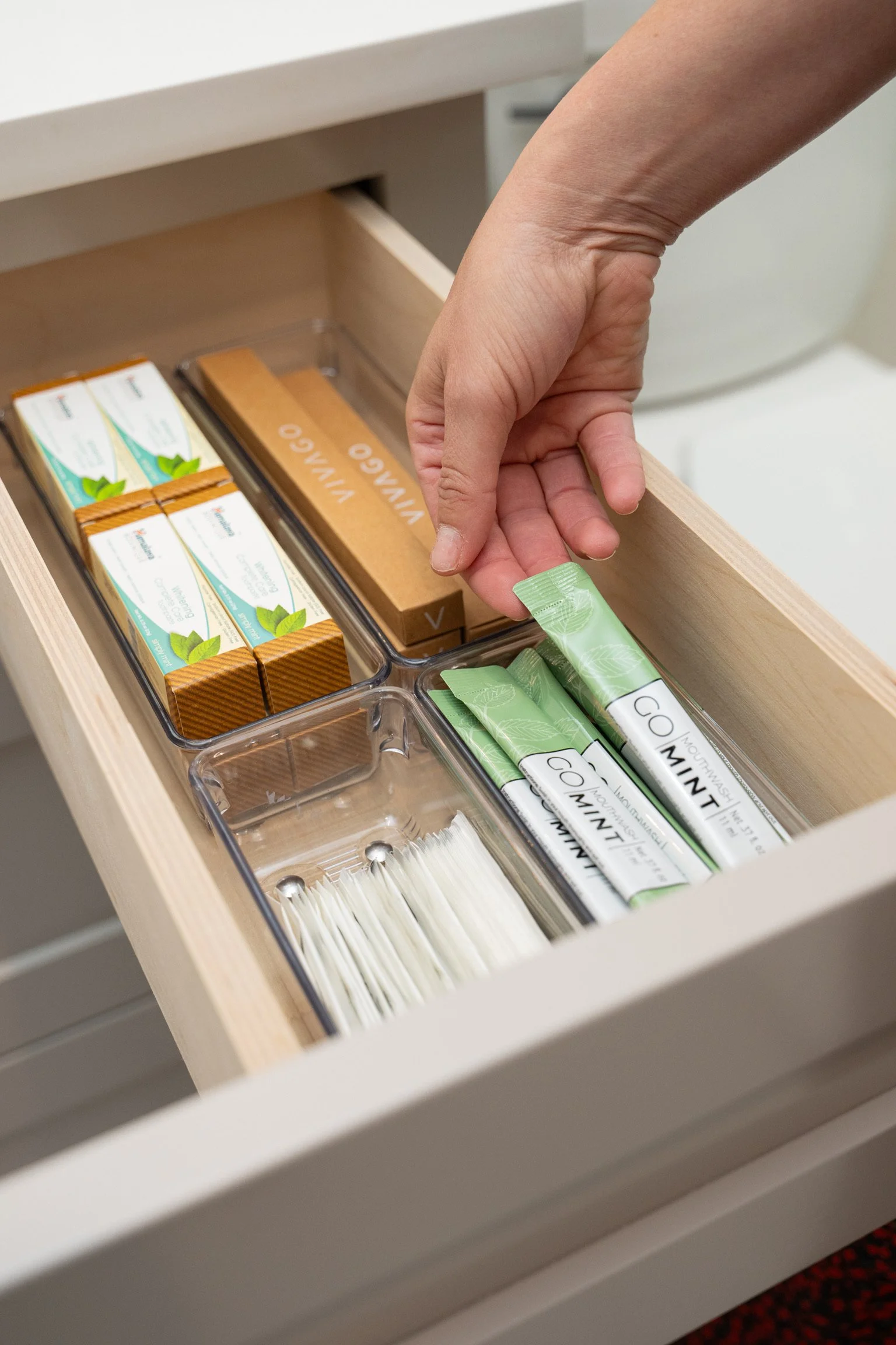 On her side, makeup isn’t part of the daily routine, so we created a system under the sink to store her collection. Easily accessible for special occasions, but tucked away to keep the vanity area clear for everyday use.