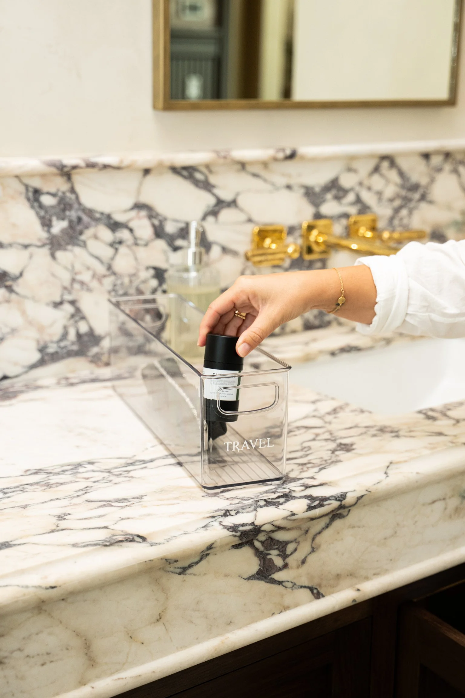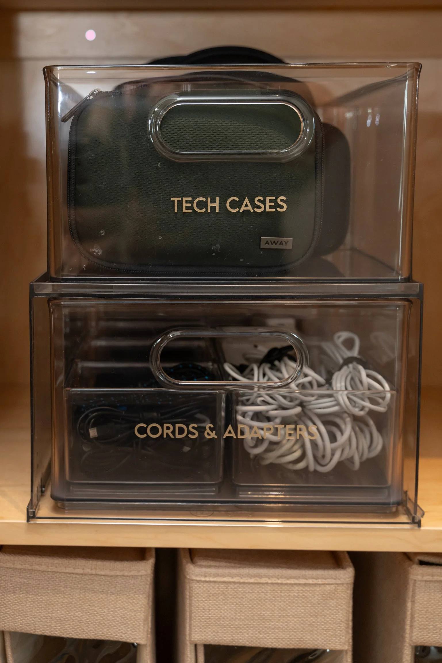 one centralized travel basket (this is a 24/7/365 holding place for the small travel items such as: tech wraps, travel size containers, extra chargers)