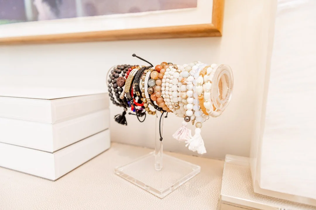 Pro tip: walk into your closet and identify where your eye goes first. That is the perfect location for your most beautiful items and a little functional decor.