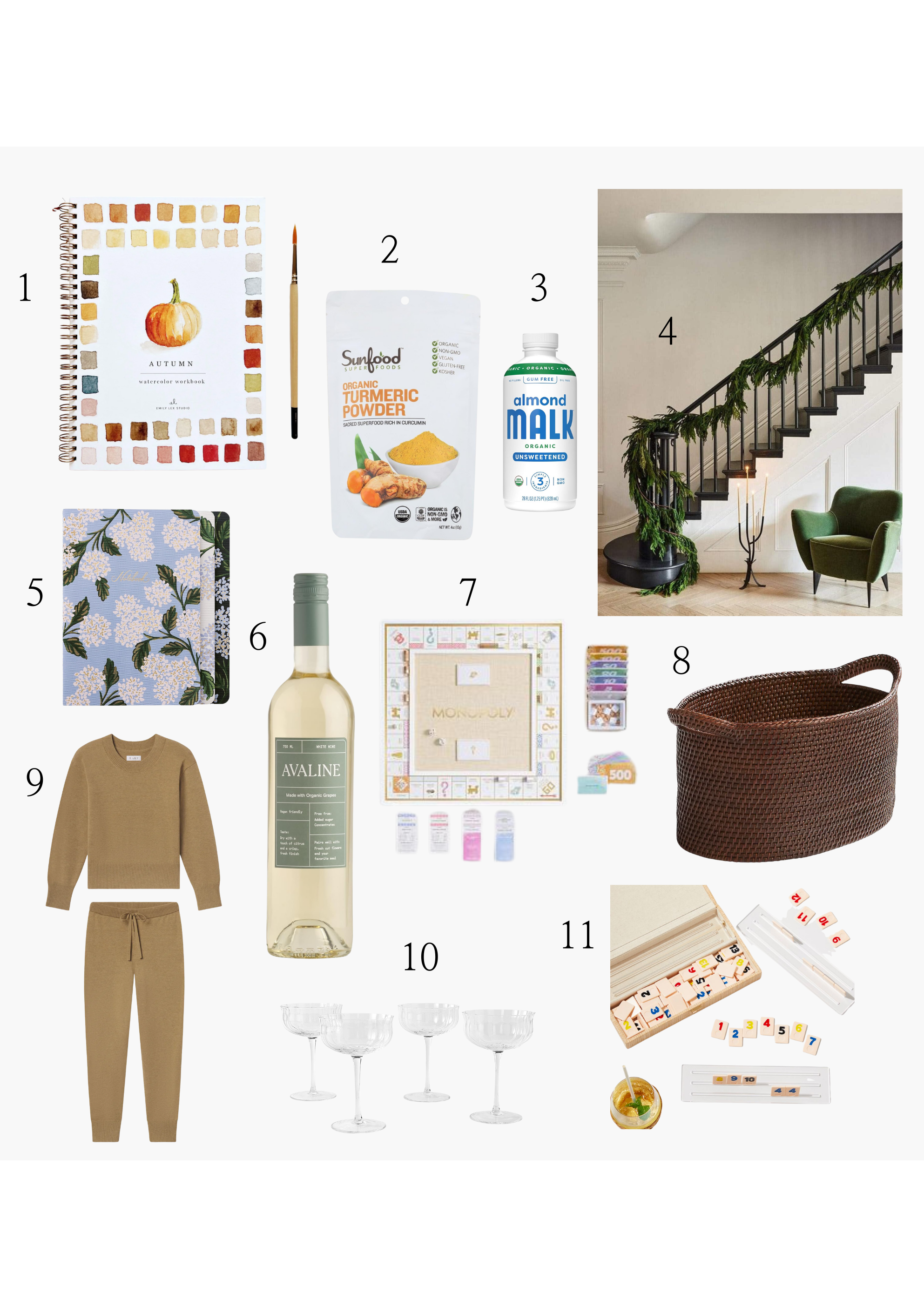 1. Autumn Watercolor Book 2. Turmeric 3. Almond MALK 4. Holiday Organizing 5. Notebook 6. Avaline Wine 7. Monopoly 8. Rattan Basket 9. Lounge Set 10. Wine Glasses 11. Rummikub